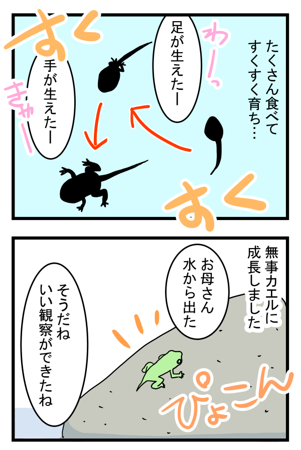 おたまじゃくしはすくすく成長しついに水から出てきました。