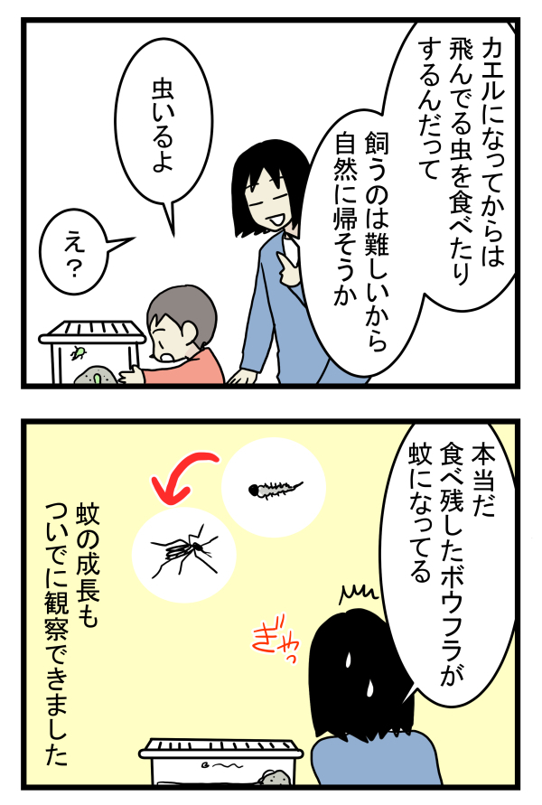 飼うのはちょっと難しそうなので自然に帰そうとしたらなんとおたまじゃくしのエサ用に入れていたボウフラの一部が羽化して蚊になっていたのでちょうどいいエサになりました。