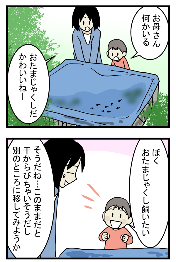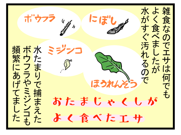 エサはうどんやごはん、にぼし、葉物野菜などなんでもよく食べましたがろ過する装置を付けてなかったのですぐに水が汚れてしまいました、そこで生き餌として、水たまりに湧いていたボウフラやミジンコを捕まえてあげてみたら水が汚れにくくなりました、新鮮なエサにおたまじゃくし達も喜んでいました。