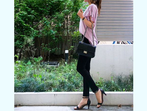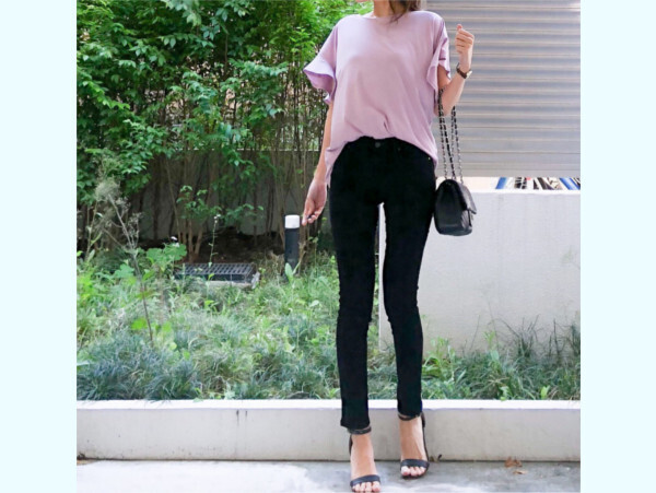「今日の関東は遂に今年いちばんの暑さ。毎日夏コーデとなっております」/身長161cm、フリルスリーブT : ユニクロ(Lサイズ・71 PURPLE)、ウルトラストレッチジーンズ : ユニクロ(23インチ・09 BLACK)、バッグ : zakkabox、靴 : AmiAmi