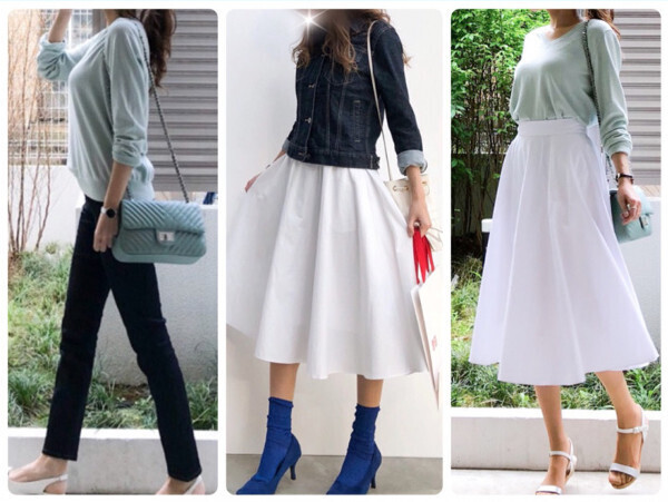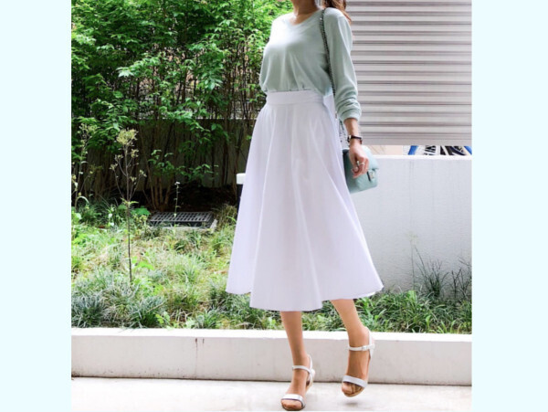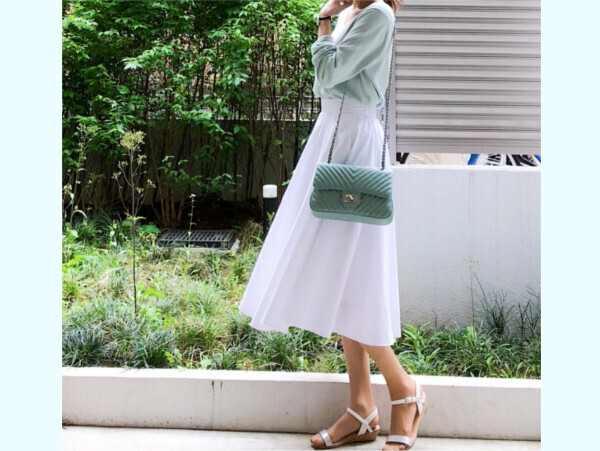 「ミントグリーンにホワイトのミルキーな感じの色の組み合わせ。春ならではの配色はデートコーデにも良さそうです」というHanaさんが選んだのはコットンカシミヤセーターとサーキュラースカートの組み合わせ。