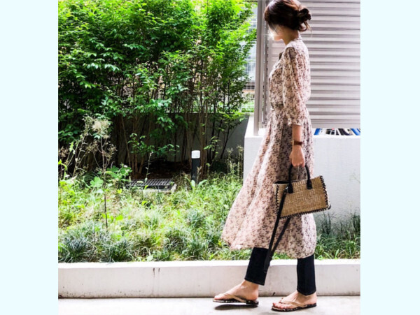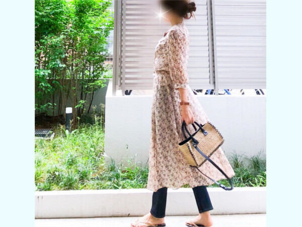 「バッグはカゴバッグ。足元はスッキリ感が欲しかったのでビーチサンダルにしました」と気負いのないリラックススタイルがとてもステキでした!