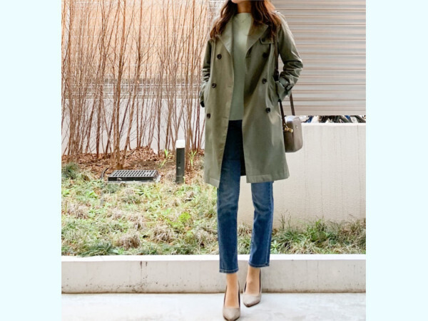 「今年の春はなんだかグリーンが気になります❤︎トレンチコートもグリーン系のオリーブ色を買いました」/身長161cm、トレンチコート : ユニクロ(XSサイズ・56 OLIVE)、コットンカシミヤボクシーボートネックロングセーター(Mサイズ ・ 52 GREEN)、ハイライズシガレットジーンズ(22インチ ・64 BLUE)、バッグ : HAYNI、靴 : SESTO
