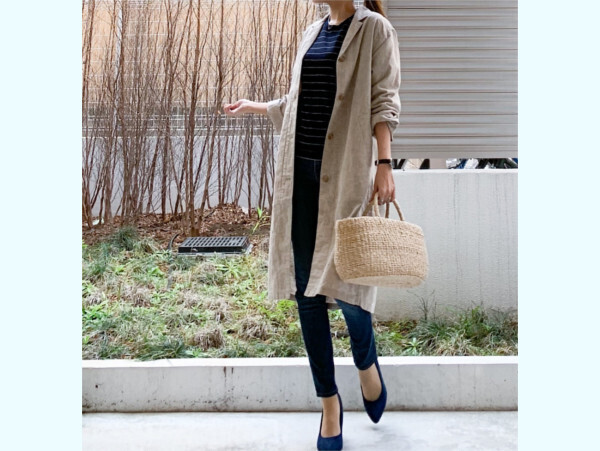 「仕事の下見へ」/身長161cm、リネンブレンドコート : ユニクロ(Sサイズ・31 BEIGE)、コットンカシミヤクルーネックボーダーセーター:ユニクロ(Mサイズ・69 NAVY)、ウルトラストレッチジーンズ : ユニクロ(22インチ ・ 69 NAVY)、バッグ : HAYNI、靴 : ミンキーミー