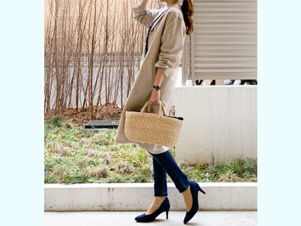 小物として合わせたのは春夏に大活躍するカゴバッグ!「お洋服は形や色も大事ですが、素材もすごく大切。その季節にあった素材の服や小物を選ぶと、自然とオシャレな感じになると思います」ということで、オシャレには季節感も重要であることが写真からも分かりますね。