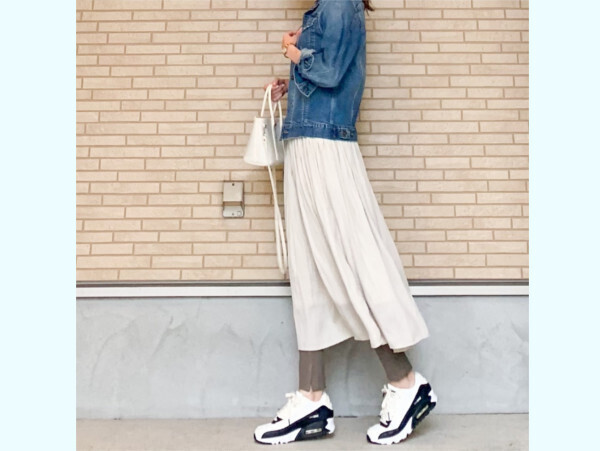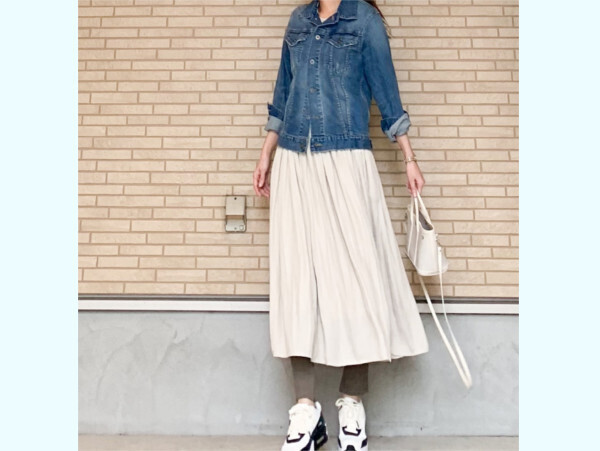 オンラインで注文していたというギャザーロングスカートは「光沢があり、サラッとした軽い生地」だそう。「たっぷり入ったギャザーが女性らしく、柔らかなシルエットです」とのことで、歩くたびに裾がひらひら揺れる様子がかわいく見せてくれそうです。デニムジャケット+スカート+ボリュームスニーカーの組み合わせも、大人カジュアルコーデの参考にしたいところですね。