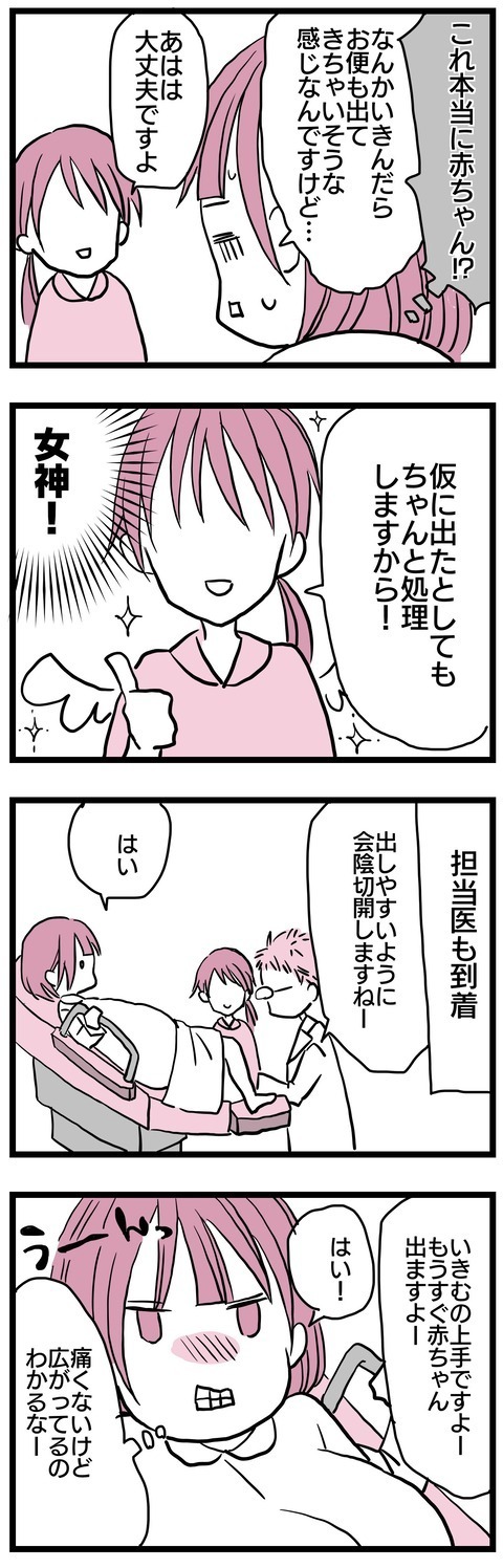 陣痛が起きるなか、麻酔のせいか心地よく寝てしまい…。その後、入院2日目午後に破水。子宮口10cmまで開くと、便秘のせいかトイレに行きたい感覚が…。助産師さんから「それ赤ちゃんですよ」と言われるのでした。